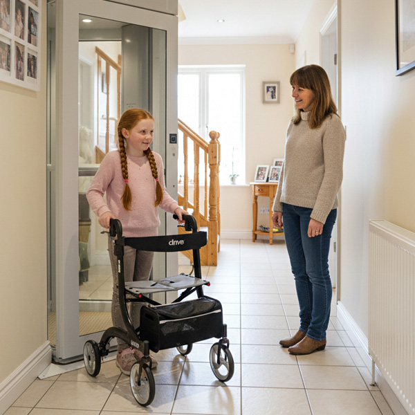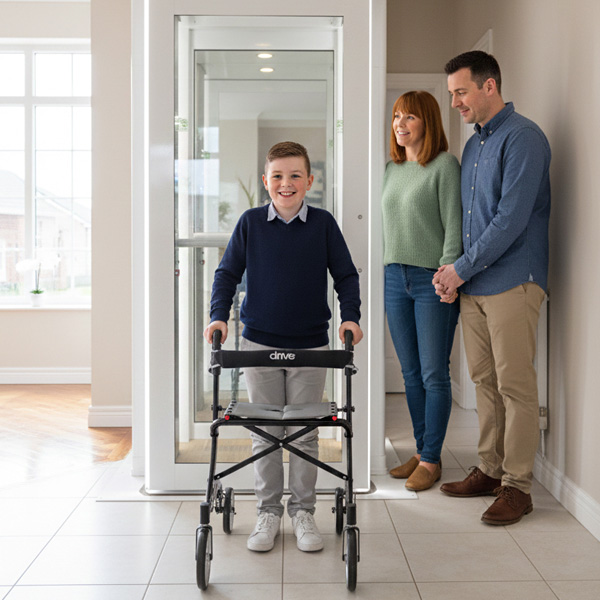 Ideally suited for homes where a stairlift is not viable or desired, the Luma requires no lift shaft and tucks neatly into a corner. The fully enclosed cabin offers a secure environment for standing transfers, featuring clear acrylic panels that reduce claustrophobia and allow parents to maintain visual contact. With a footprint of just 1186 mm x 956 mm, it preserves valuable floor space while ensuring reliable, battery-powered operation.